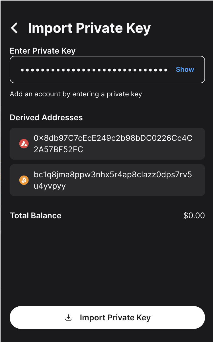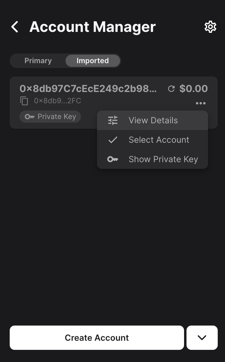 To add the private key to your core wallet, open the core extension and navigate to the Account Manager. Then click the arrow button and select Import Private Key.